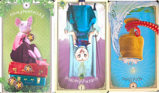 【ペンタクルの4】と【ソードの女王】*逆と【カップの4】*額